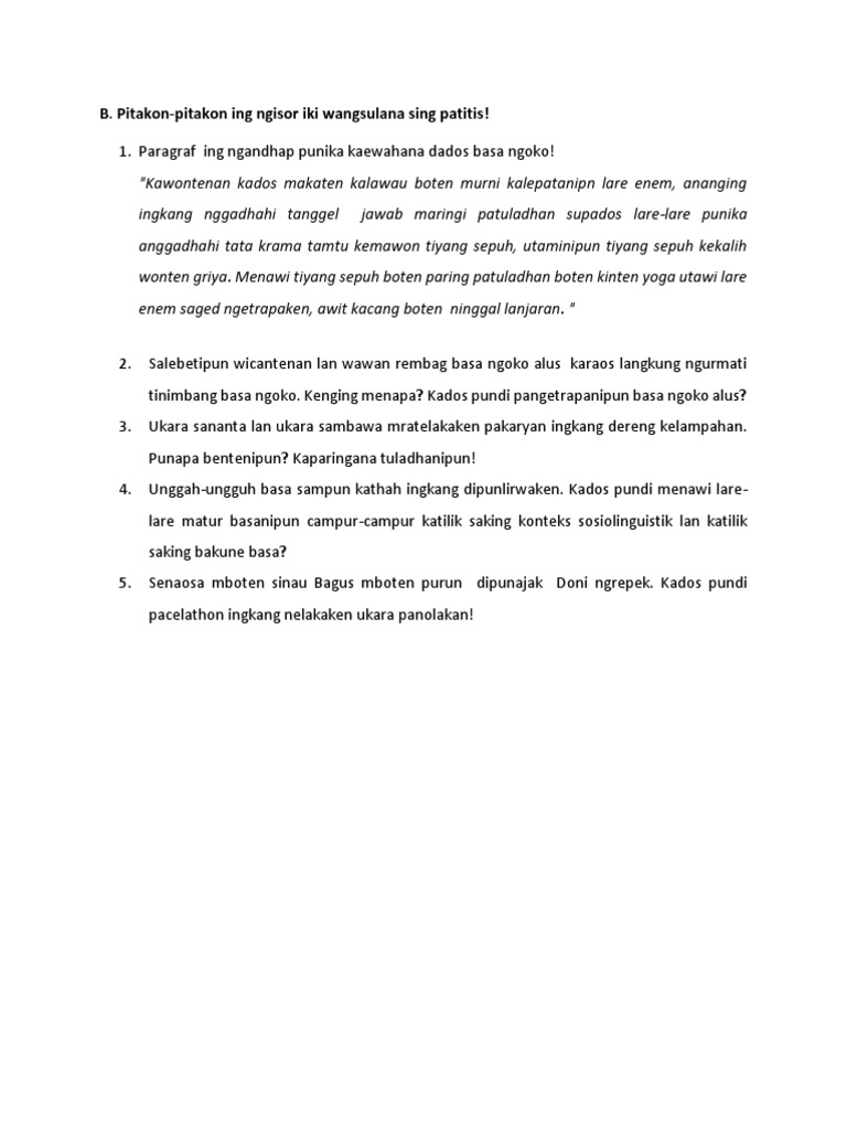Video kali ini membahas mengenai tatacara membuat suatu kali. Question from Natasyadesi1224 - Sekolah Menengah Pertama - B. Tuladha ukara sing nganggo basa ngoko alus yaiku.