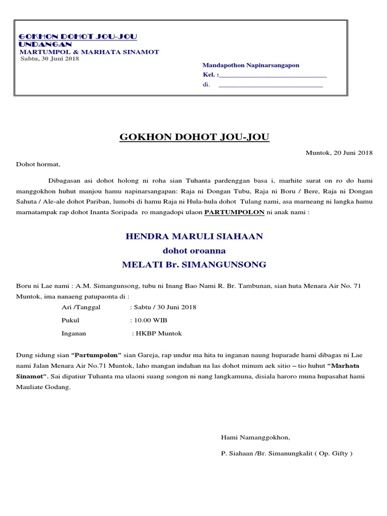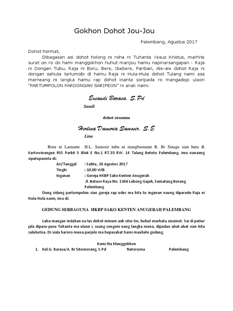 Undangan marhata sinamot. Molo parjolo marhata sinamot sian pesta unjuk dibagasan undangan ma dibahen amplop na marisi hepeng. Semua pasti udah pada tau dong yang batak batak apa itu Acara Marhusip buat yang Batak Toba sih ya. Undangan pernikahan unik Yogyakarta Stadt.